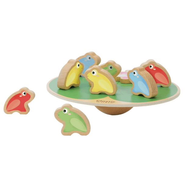 Wooden balancing water lily game with frogs on a wobble board, 11 pieces, ages 10months+, by classic world games, fine motor skills