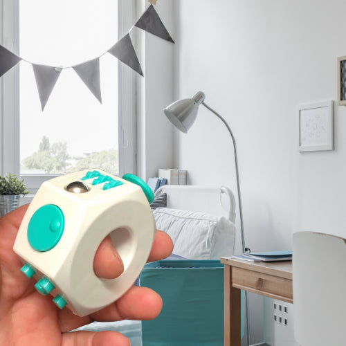 A great hand held version of the fidget cube or fidget pad that can be worn on the finger while in use. Loads of great features to keep the fidgeter occupied. Some parts silent, some have noise.