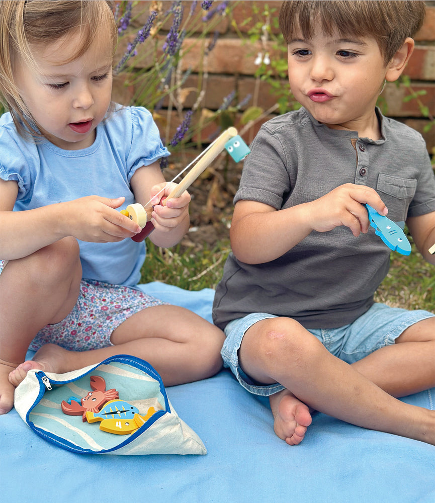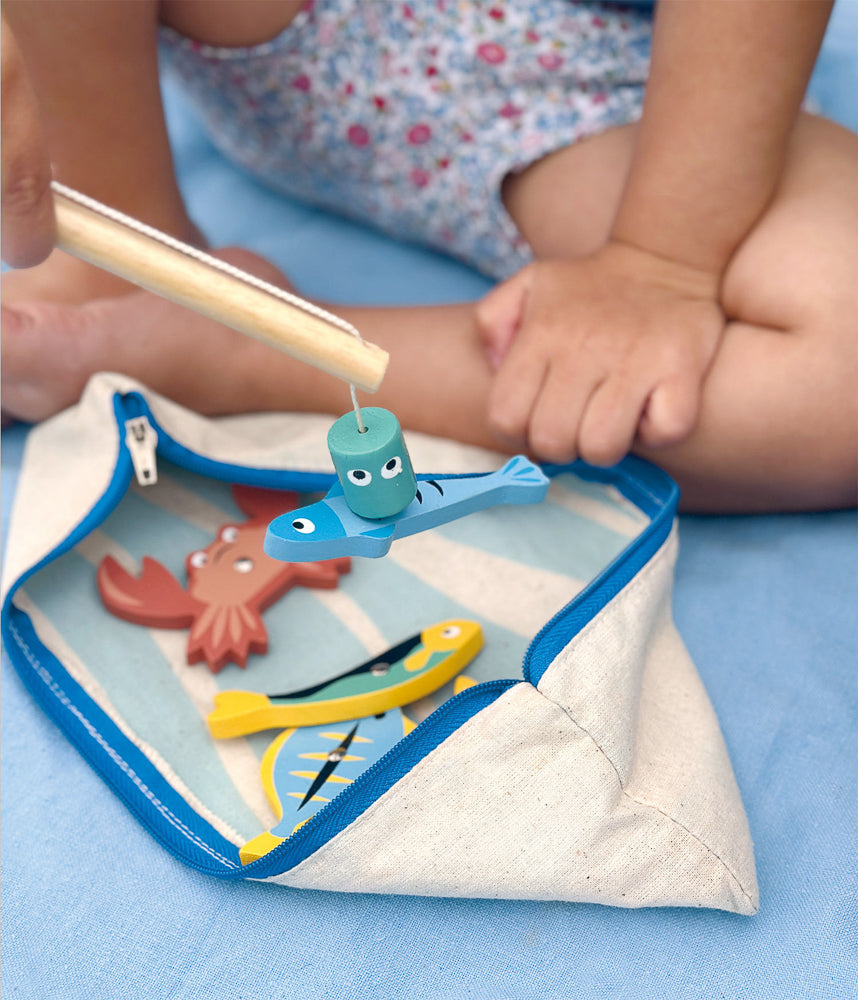 Embark on a fishing adventure with this delightful wooden fishing game! Perfect for little anglers, this set includes a magnetic rod and 7 colorful sea creatures to catch. As your child reels in each creature, they’ll uncover hidden numbers, helping to develop their counting skills. After a fun-filled fishing session, everything can be neatly stored in the wave-themed, zippable pencil-case bag for easy cleanup. Made from sustainably sourced reclaimed rubber wood and non-toxic paint, this game is both eco-friendly and safe for young explorers.