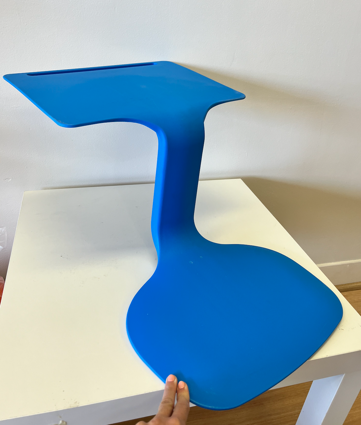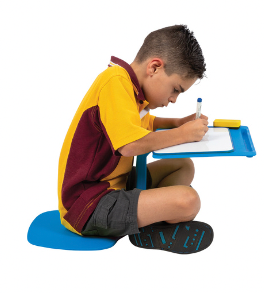 Blue desk and chair in one, lightweight, portable, stackable. good for flexible learning