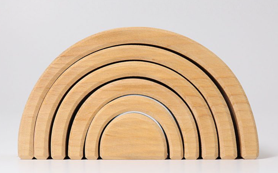 This Medium wooden Rainbow is a lovely first stacking set, wonderfully versatile, open ended and represents the element of air. The natural wooden tunnel can be used in as many ways as your imagination allows; perhaps it’s a cradle to rock a small baby to sleep, a bridge, a tunnel, a fence or small house or use it to build sculptures… this toy will always have the ability to be integrated into building and imaginary play. Played in conjunction with one or more of the larger building sets the possibilities are endless.