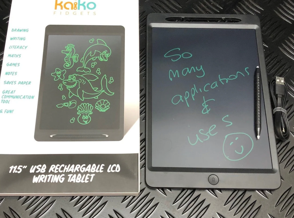Our Black USB-charging 11.5" LCD board has a monochrome image and comes with a dual-tip stylus, perfect for writing and drawing. It is a great literacy tool for the classroom, home, on the go, and in vehicles.