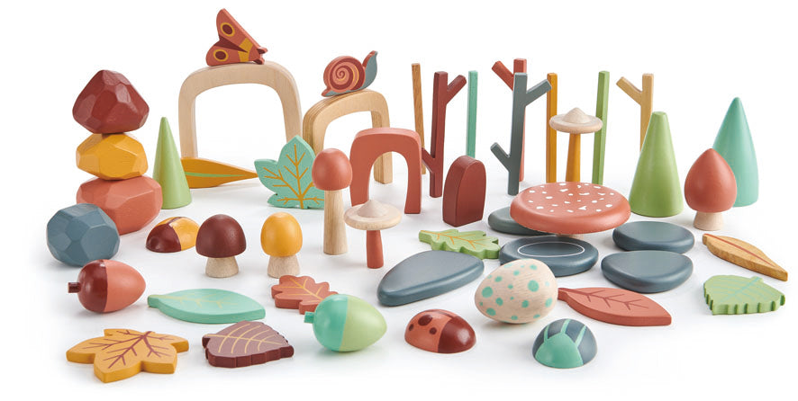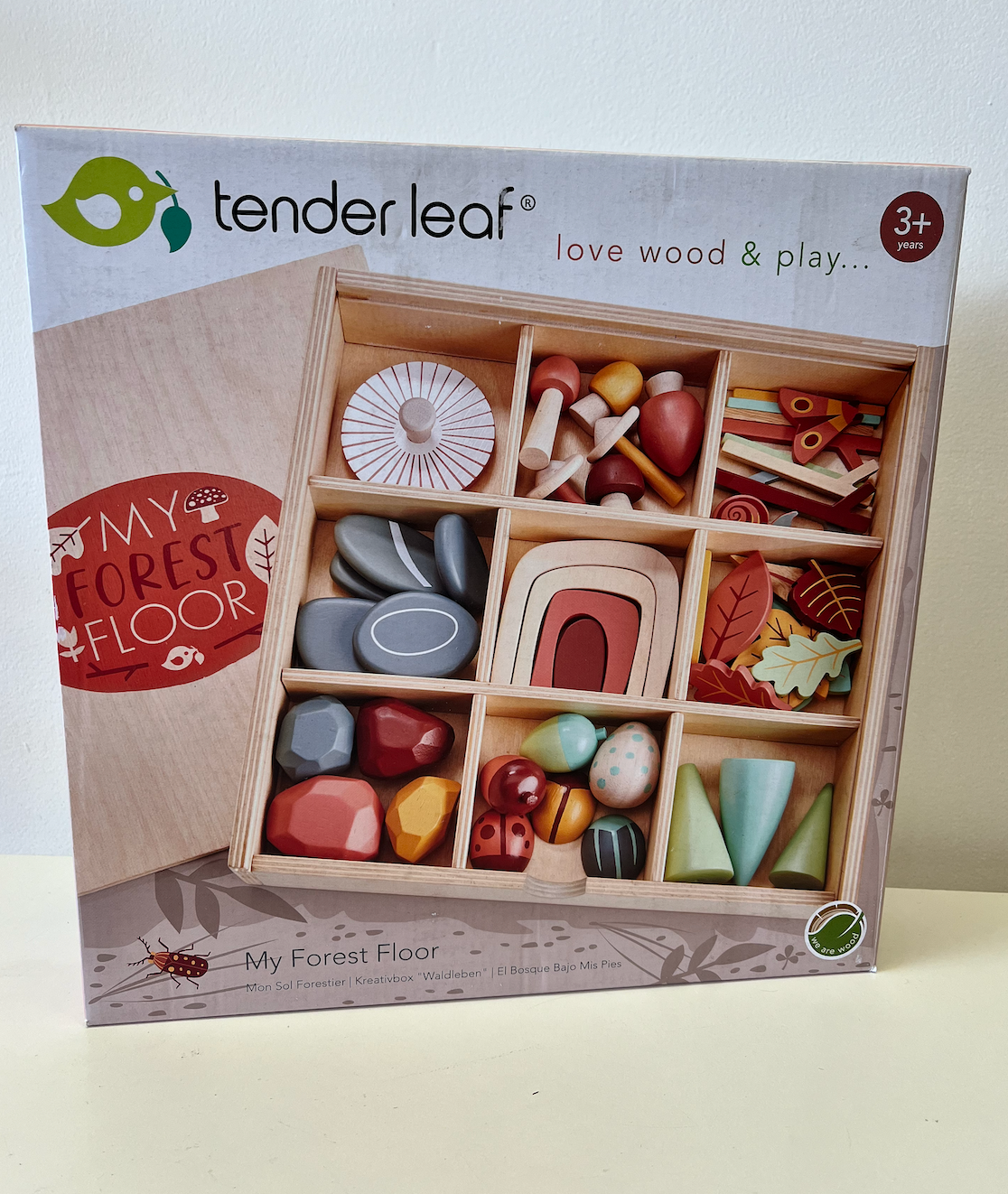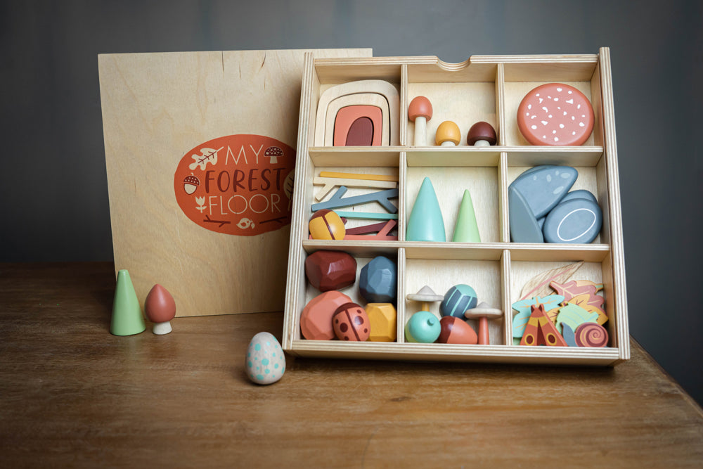 Tender Leaf love wood and play, My Forest Floor Set, ages 3+, 56 pieces, chalkboard lid, open ended creative play