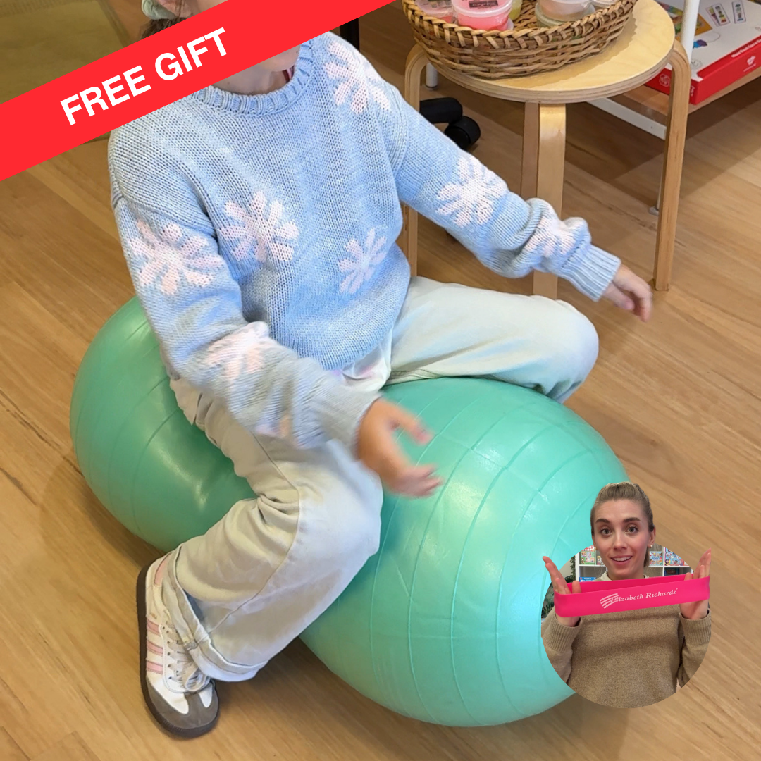 The shape of the ball allows movement in just one plane such as forward and backward but not side-to-side, providing more control. This makes it especially useful for children with balance difficulties, low muscle tone, developmental delays, or sensory-seeking behaviours.
