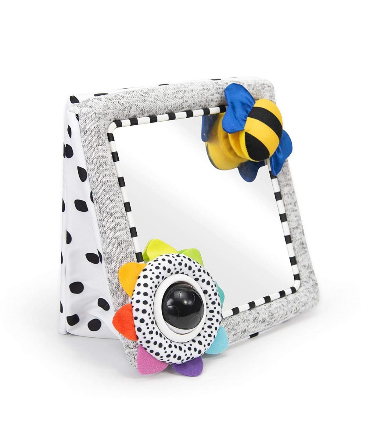 The Sassy Tummy Time See Me Floor Mirror is designed to encourage babies to focus on a human face with its large true-reflection mirror. The symmetrical bee attachment inspires vision and tactile exploration, while the high contrast flower and tracker ball aid in developing visual perception. This baby activity toy features a soft frame that is perfect for a baby's environment, and the easel back allows the mirror to stand on flat surfaces, providing a versatile play option for little ones.